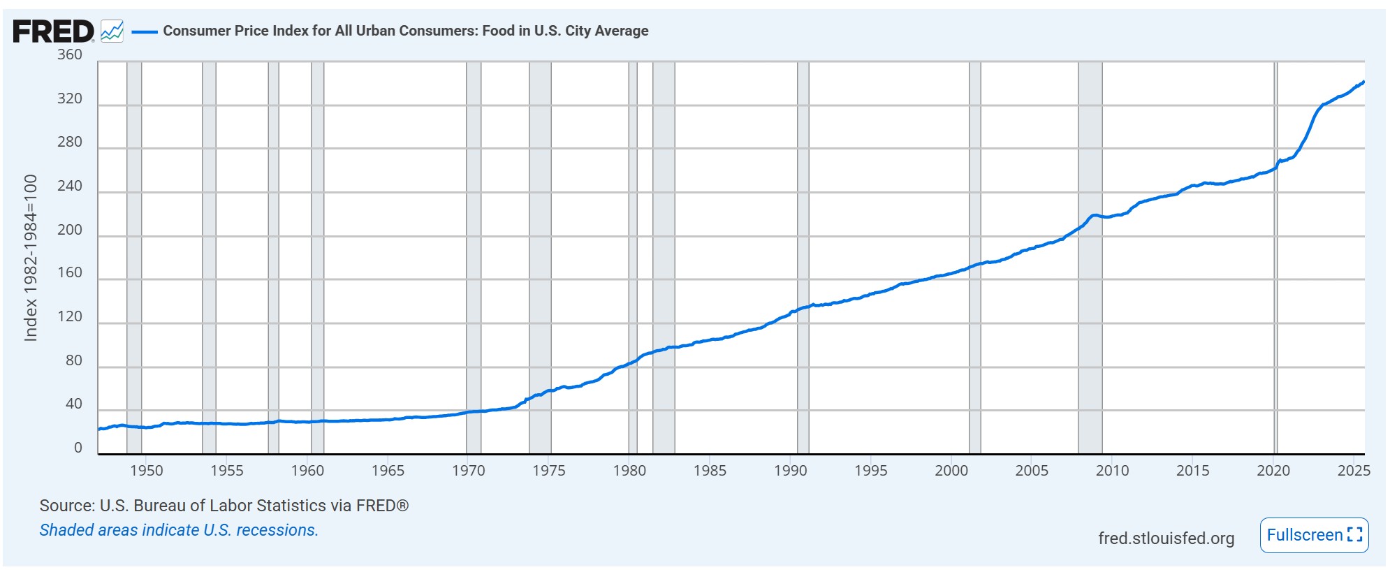 Note that no presidency – Republican OR Democrat – has ever been able to significantly lower grocery prices for Americans without the fool’s gold of massive federal subsidies and/or artificially low federal interest rates (both of which contribute directly to inflation over time). The chart proves it.